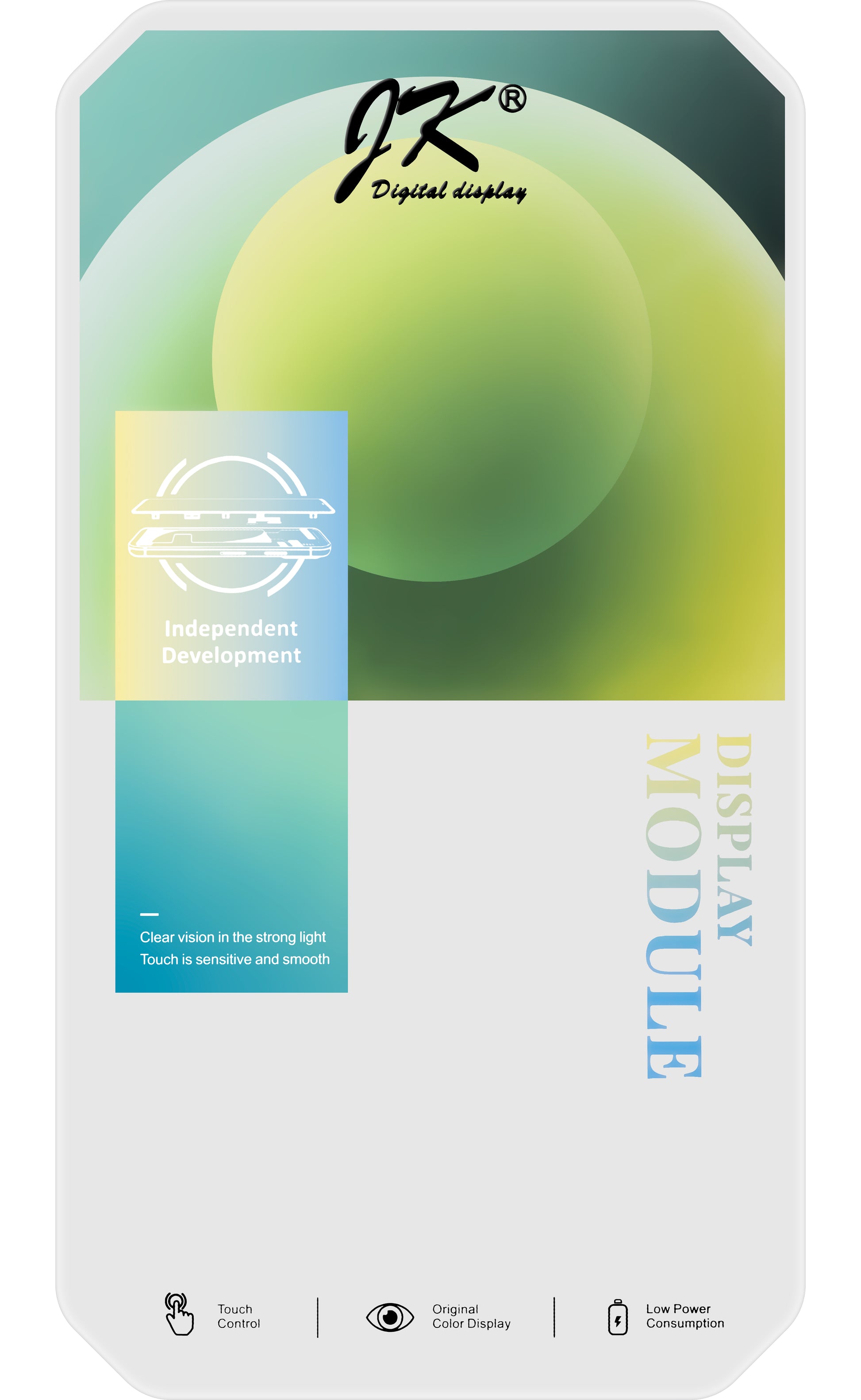 120Hz touch control, high wear resistance, wide range of colors, low power consumption.