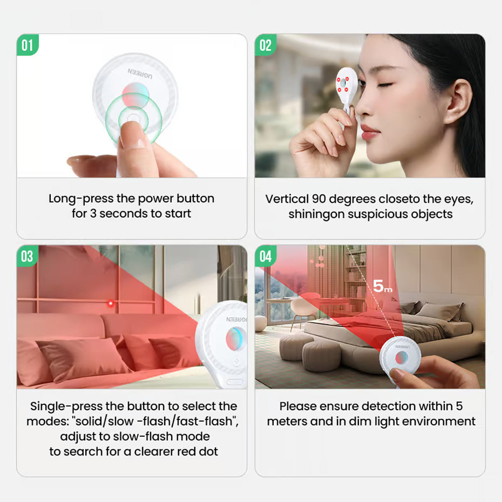 • The Ugreen detector quickly identifies spy cameras and other hidden surveillance devices, providing safety in hotels or rented spaces.
