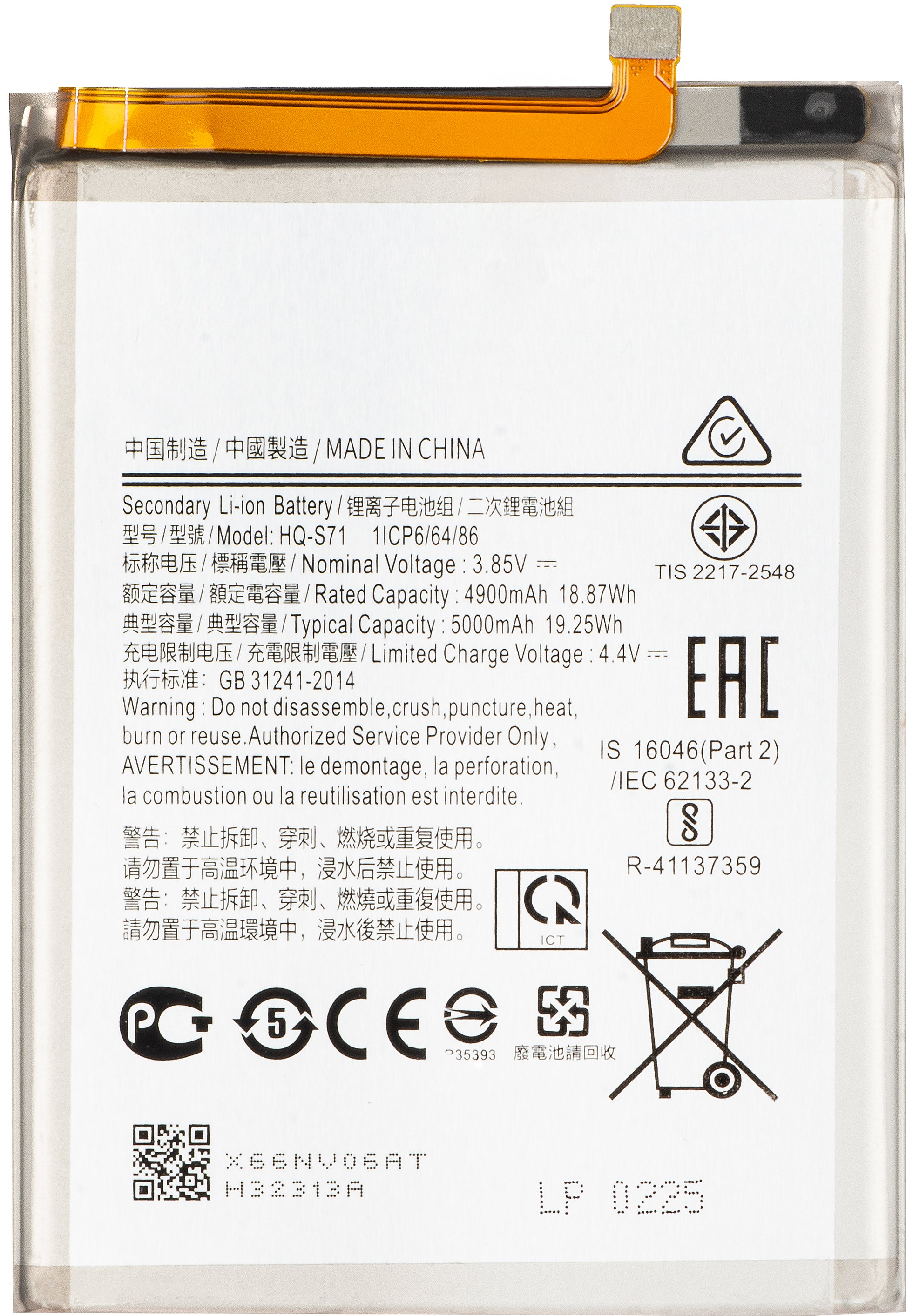 | Μοντέλο μπαταρίας | HQ-S71 |